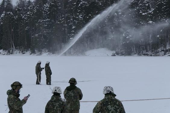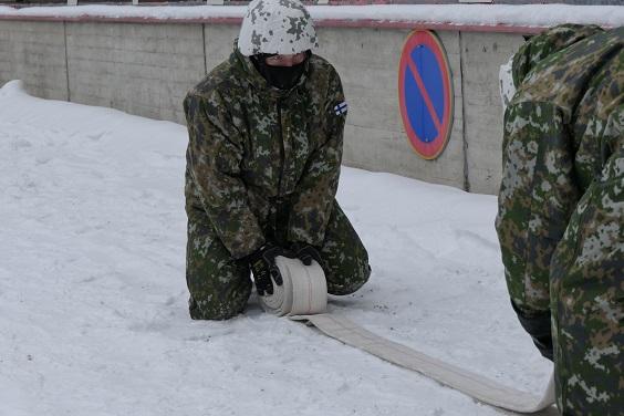 Etelä-Karjalan maakuntakomppaniasta lappeenrantalainen Jonne Härkänen (kuvassa) ja ruokolahtelainen Risto Savelius sekä Etelä-Kymenlaakson maakuntakomppaniasta virolahtelainen Janina Rapo, kotkalainen Ella Luukka ja Miika Ikonen tutustuivat palolaitoksen töihin. He muun muassa tekivät letkusta kiepin ja rullan. He myös kokeilivat veden ruiskuttamista ja siten saivat tuntumaa palon sammuttamiseen.