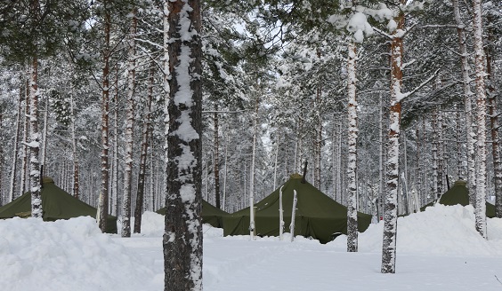 Kuvassa telttamajoitusta maastossa. Maastoharjoituksen aikana aliupseerit majoittuvat teltoissa, mutta muuten PTOKY-kurssin aikana heillä on majoitus varuskunnassa.