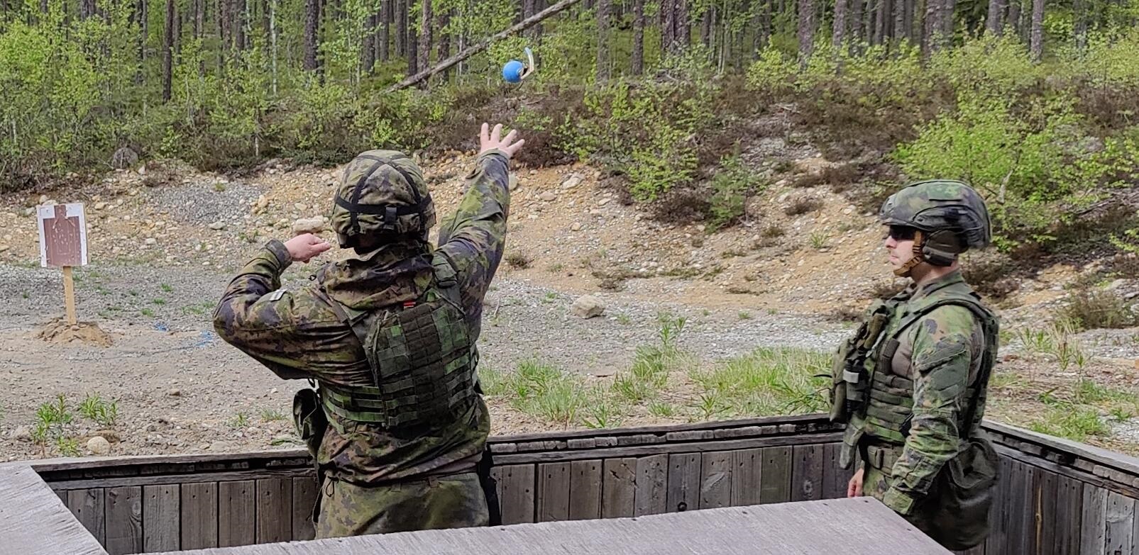 Kuvassa: Käsikranaattiammunnassa opiskelijat osallistuvat Jalkaväkikoulun kouluttajan johtamaan esimerkkiammuntaan, jossa he saavat koulutuksen ja parhaat käytänteet käsikranaattiammunnan suunnittelua ja johtamista varten. Lisäksi he toimivat tulitoiminnan valvojina heittoasemassa ja heittävät itse käsikranaatteja.