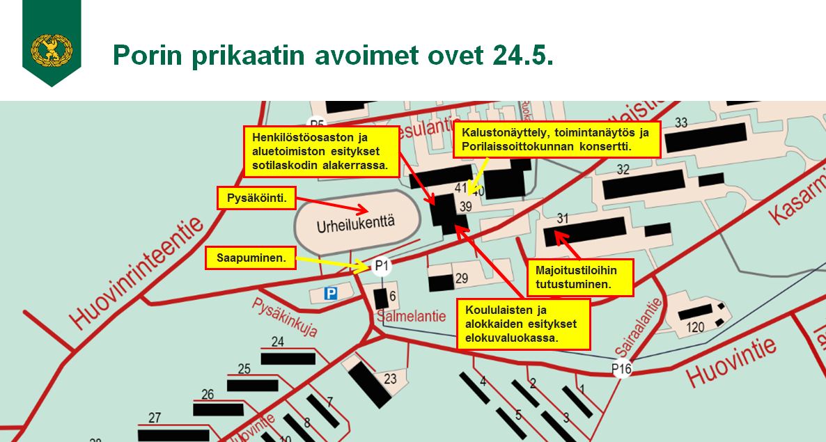 Vieraita pyydetään varautumaan henkilöllisyyden todistamiseen saapumisen yhteydessä. Sotilaskoti palvelee tapahtumavieraita koko päivän. Porin prikaatin avoimien ovien tapahtumakartta ja -ohjelma ovat luettavissa myös Porin prikaatin verkkosivuilla www.maavoimat.fi/porin-prikaati