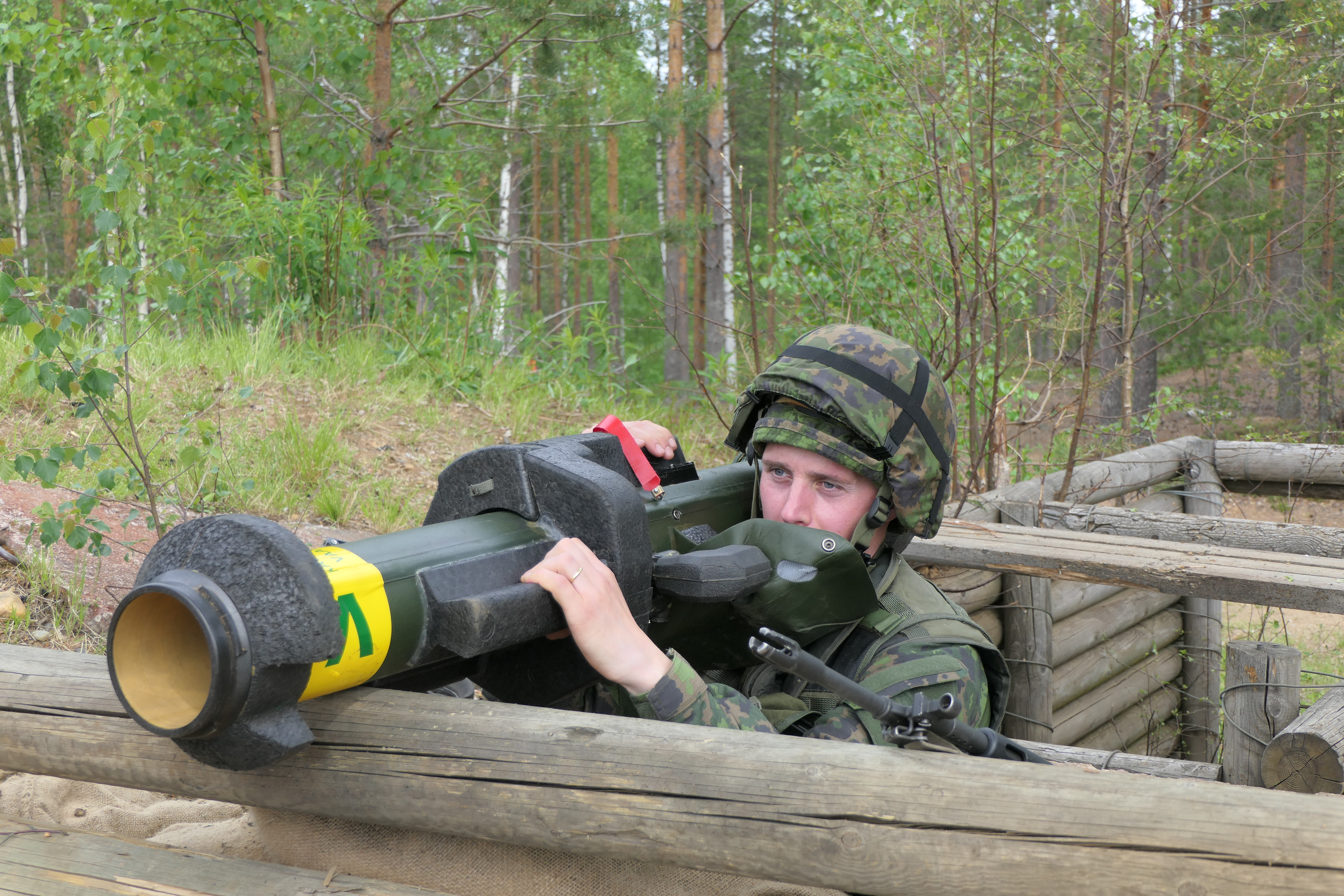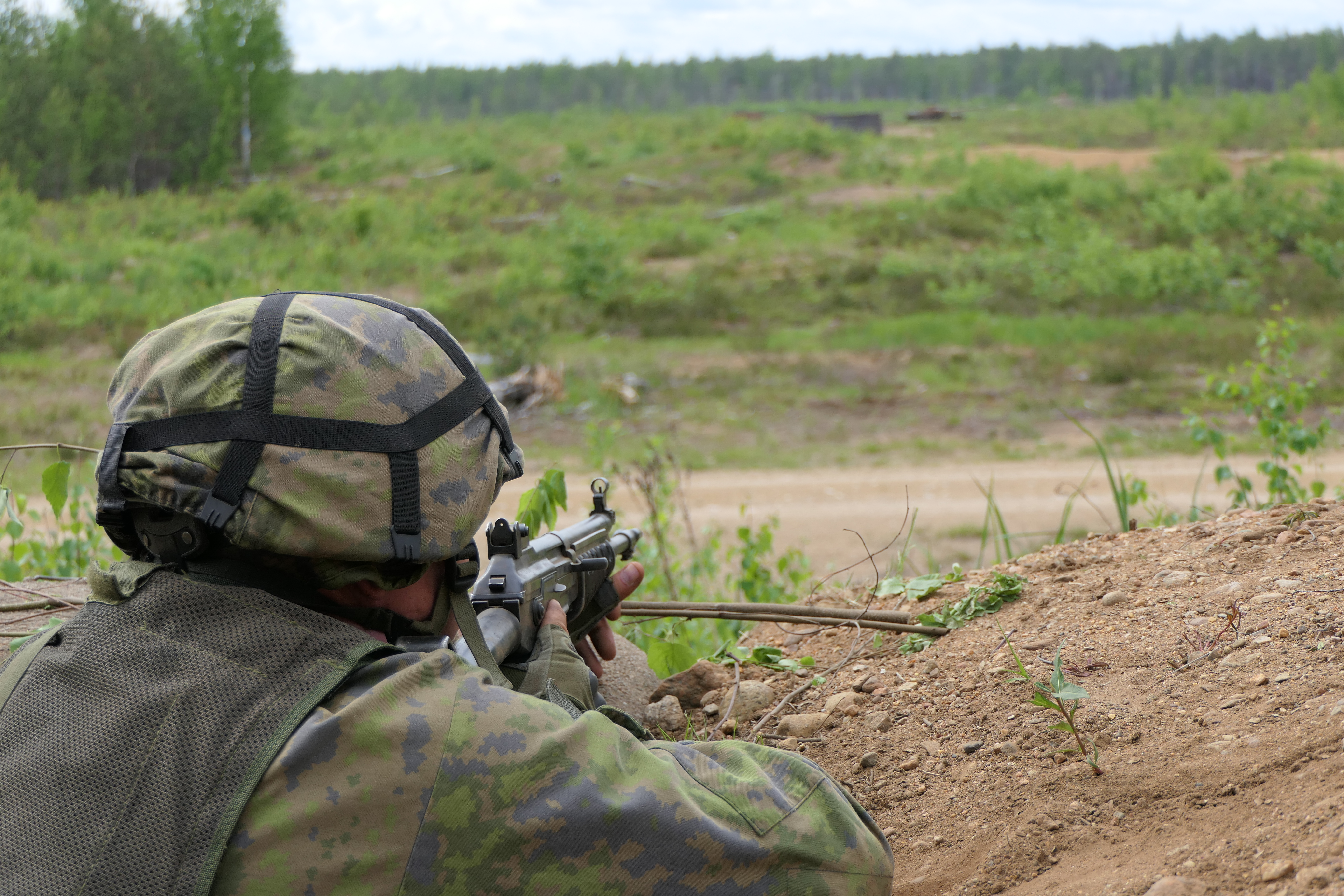 Kuvassa reservin alikersantti Antti Parviainen Savitaipaleelta toimii ryhmänjohtajana ja ampuu apilaksella (tässä menossa kuivaharjoittelu).