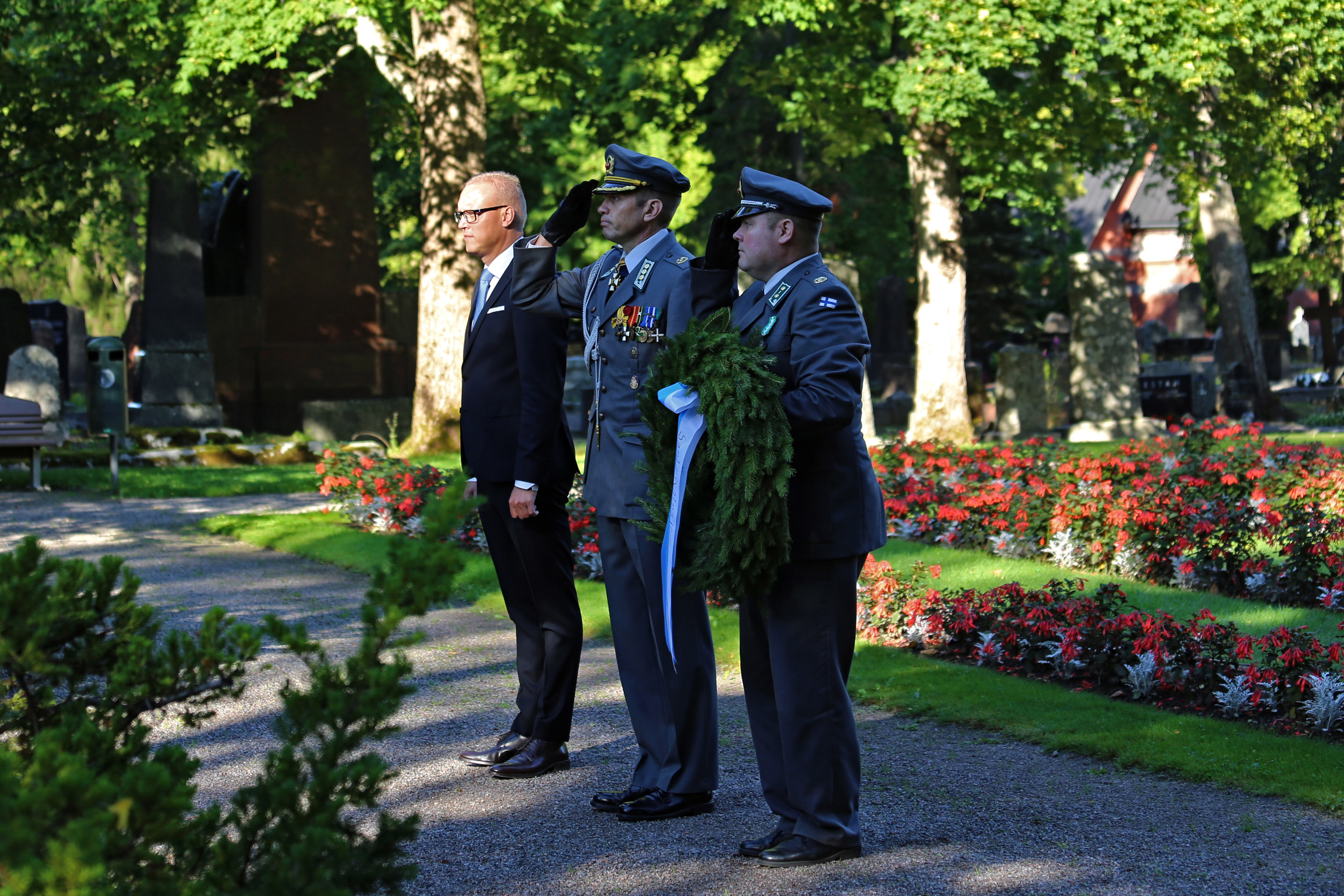 Kaartin jääkärirykmentin komentaja eversti Ahti Kurvinen laski seppeleen sankarihaudalle Porvoon hautausmaalla yhdessä Porvoon kaupunginjohtajan Jukka-Pekka Ujulan kanssa.