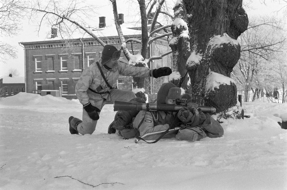 Varusmieskoulutusta Uudenmaan Rakuunapataljoonassa Rakuunamäellä 1970-80-luvulla. Aseena kevyt sinko 55 S 55. Kuva: Sotamuseo, kuvaaja: Matti Kaltokari.