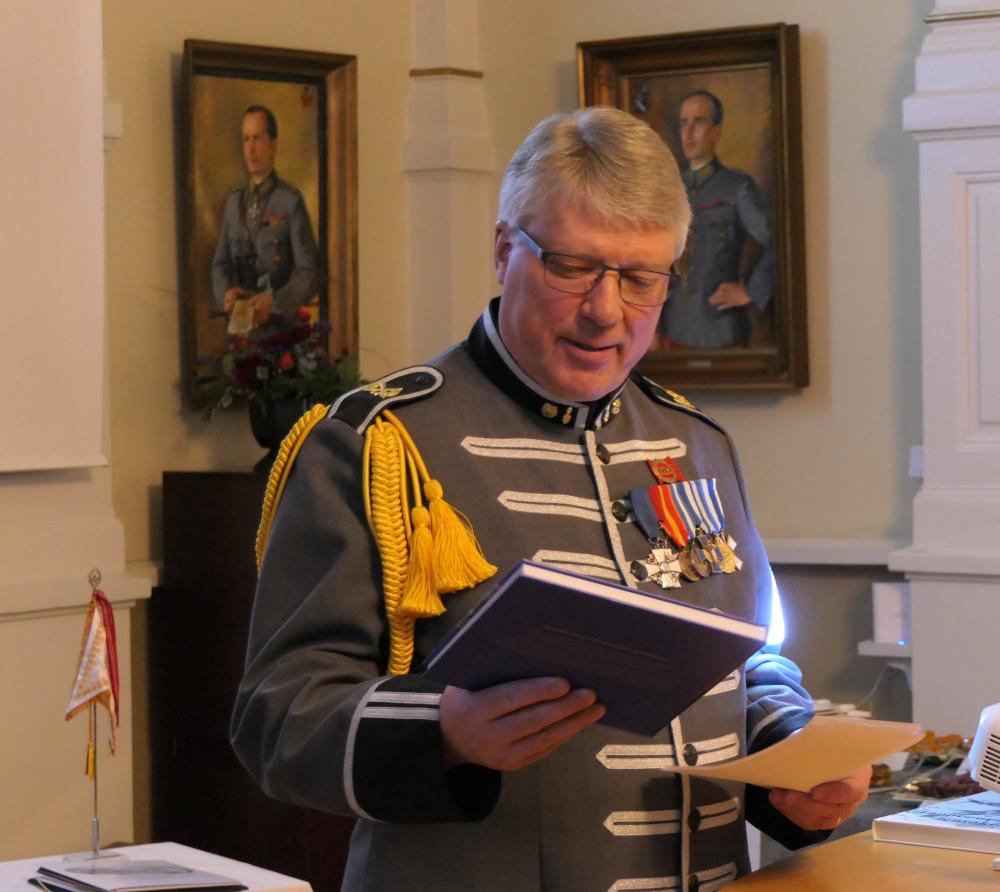 - Ratsuväkimusiikin perinteet ovat siis monisatavuotiset ja se on myös erittäin vaikuttavaa, musiikkimajuri Riku Huhtasalo (kuvassa RAKSK100-historiikki kädessään) toteaa.