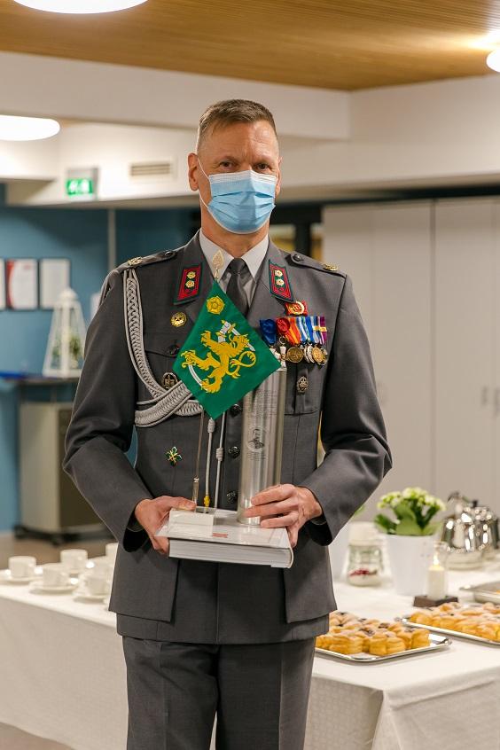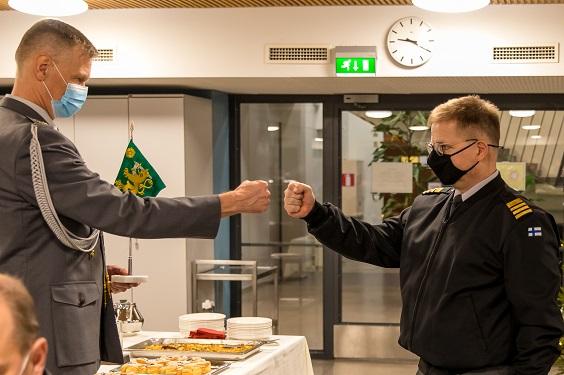 Esa Hyytiäinen sai Maasotakoulun pienoislipun Maasotakoulun johtajalta, eversti Kari Pietiläiseltä esikuntapäällikön vaihtotilaisuudessa joulukuussa. Kuvassa näkyy kättelyn sijaan koronavarotoimena tällainen rystysten "kättely".