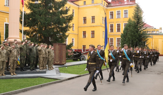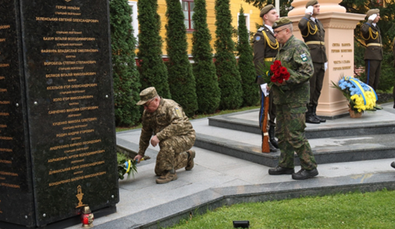 Matka alkoi koskettavalla ja juhlavalla seremonialla akatemian kaatuneiden entisten opiskelijoiden muistomerkille maanantaina 9. lokakuuta. Ortodoksipapin lyhyen saarnan, rukouksen ja siunauksen jälkeen laskimme kukkalaitteet yli 300:n luutnantin-majurin sotilasarvossa kaatuneen sankarivainajan kivipaasille. Kun ryhmityimme akatemian johdon ja opettajiston rinnalle muistomerkin viereen, akatemian johtaja otti vastaan kadettikomppanian ohimarssin, jonka ryhdikkyyttä ja rytmikkyyttä ei voinut olla ihailematta. Ohimarssin päätyttyä akatemian henkilöstö lauloi Ukrainan kansallislaulun mieleenpainuvalla tavalla, kunnialaukausten rytmittäessä kaunista ja voimakasta laulua.