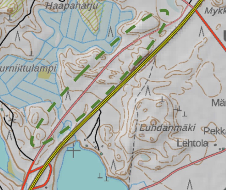 Kartassa vihreällä katkoviivalla tiealue, jossa harjoitus toteutetaan.