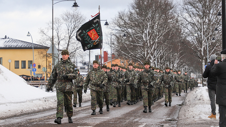 Liikenne Kadettikoulunkadulla on ohimarssin ajan pysäytetty.