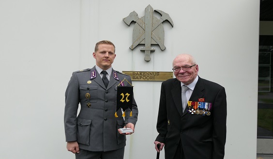 Päiväjuhlassa puheen piti JP 27:n perinneyhdistyksen edustaja Martti Porvali. Hän myös luovutti Pioneerikoululle perinneyhdistyksen standaarin. Kuvassa Porvali on Pioneerikoulun johtajan sijaisen, kapteeni Tuomas Burken kanssa.