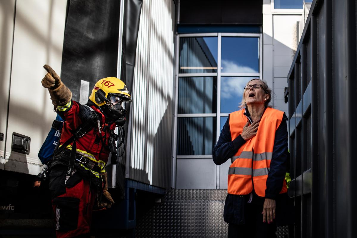 Hälytysääni ujeltaa ja savua tupruttaa ulos lastauslaiturin oviluukuista. Seuraavaksi ulos ilmestyy ihmisiä, jotka maalautuvat sinisiksi Kanta-Hämeen pelastuslaitoksen vilkkuvien valojen loisteessa. Valtaosa hallin väestä on kokoontunut kukkulalle, mutta kaikki eivät pääse ulos omin jaloin. Osa kompuroi henkeään haukkoen pelastusväen saattelemana.