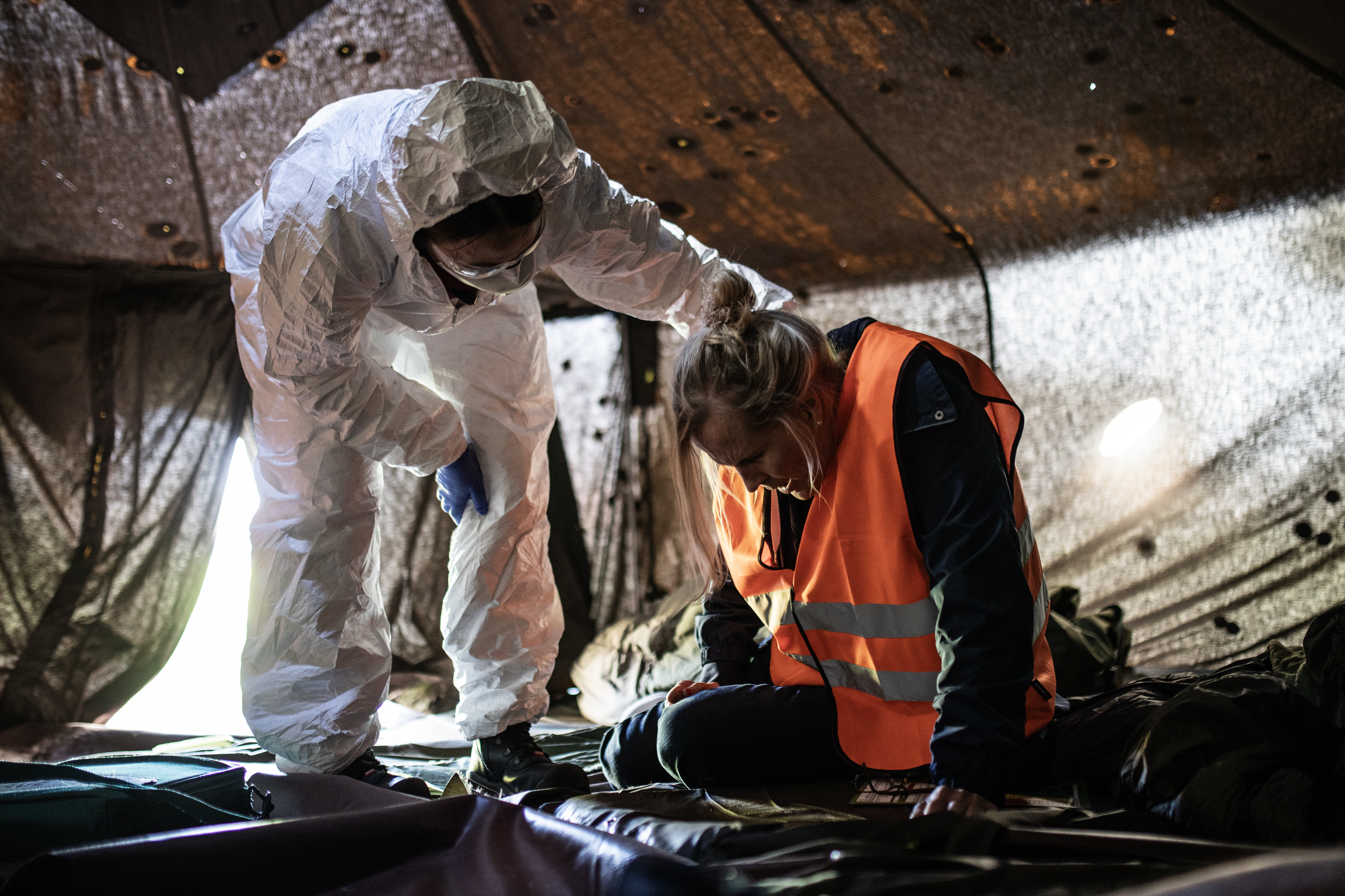 -Ei hätää, apu on lähellä, rauhoittelee pelastaja ja ohjaa henkilön vartioidulle ensiaputeltalle, jossa häntä vastassa on kaksi suojapukuun pukeutunutta ensihoitajaa. Paikalla on useita poliisi- ja pelastusyksiköitä ambulansseineen.