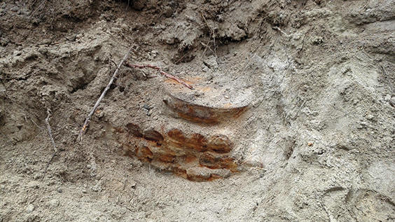 Ampumatarvikkeiden hävittämisessä toteutettiin samalla tavalla sekä myös maahan kaivamalla. Maahan upottamisessa kaivettiin maahan joko metrin syvä monttu, jonne yksittäiset ammukset haudattiin. Suuremmat määrät kaivettiin noin 2–2,5 m syvyyteen ja peitettiin. (kuva 4)