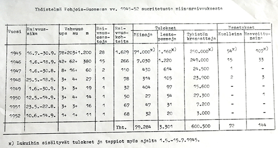 Miinanraivaamisorganisaation raivaamat räjähteet 1945 - 1952 lakkautetun Pohjois-Suomen sotilasläänin esikunnan tekemän tilastoinnin mukaan.