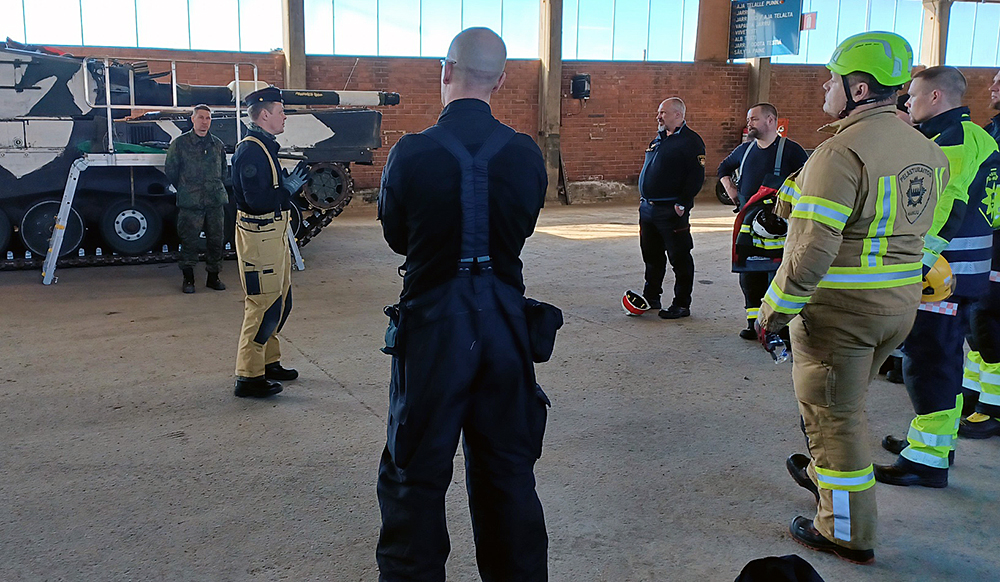 Pelastuspäällikkö Jukka Hämäläinen Maasotakoululta sekä ylivääpeli Riku Väisänen Kainuun prikaatista kouluttamassa Leopard 2A4 -taistelupanssarivaunun teknisiä ominaisuuksia sekä erityispiirteitä pelastustoiminnan näkökulmasta.