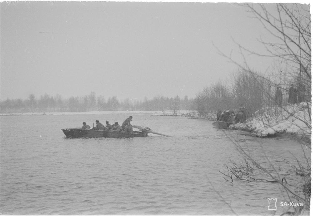 KUVA 11: Ratsuväki ylittää Itä-Karjalassa sijaitsevaa Suunujokea syöksyveneillä. Kuva: Majuri Lukkari 27.10.1941.