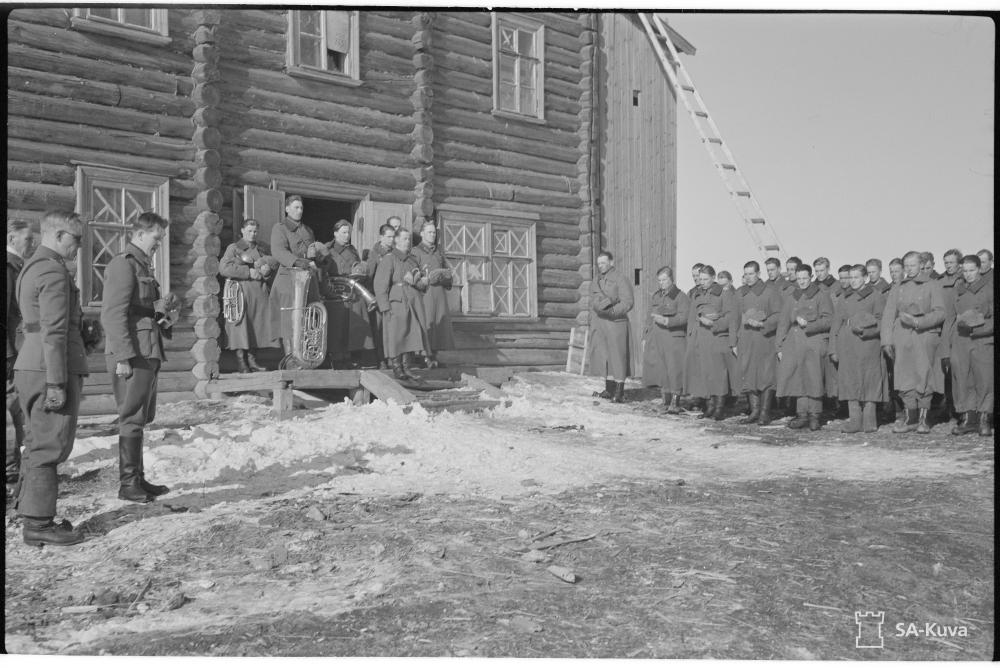 KUVA 13: Ratsastavan patterin eli hevosvetoisen tykistön hartaushetki palmusunnuntaina vuonna 1942 Sungussa. Kuva: M. Vuorela.