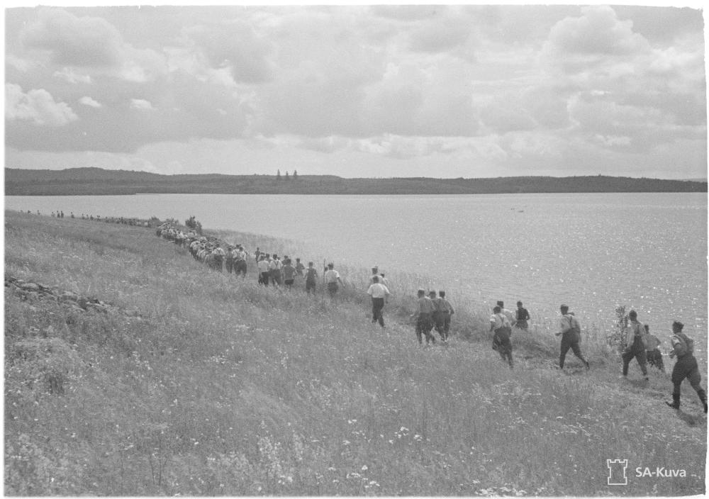 KUVA 16: Kuvaaja on ikuistanut Sungun lohkon kesäurheilupäivien maastojuoksukilpailun. Kuva: Sotilasvirkailija E. Nurmi 7.7.1942.