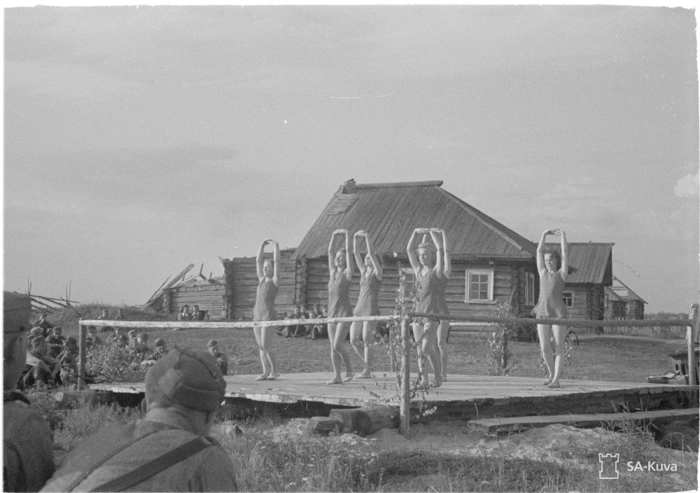 KUVA 17: Viihdytyskiertue Sungussa. ”Tampereen Säkenien” tytöt esittävät voimistelua URR:n 2. ja 3. eskadroonan sotilaille. Kuva: Sotilasvirkailija E. Nurmi 7.7.1942.