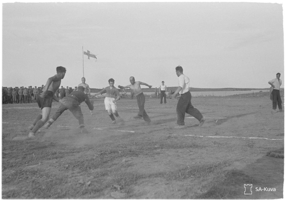 KUVA 19: Sotakentillä pelattiin myös jalkapalloa. Rakuunat olivat taitavia ratsastajia, mutta huonoja palloilijoita. URR nimittäin hävisi Kevyt Patteristo 13:sta murskalukemin 9–0. Kuva: E. Nurmi 12.7.1942.