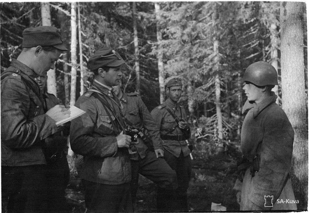 KUVA 2: Osasto E:n ensimmäinen vanki Uudenmaan Rakuunarykmentin (URR) komentajan everstiluutnantti Hans Olof von Essenin kuulusteltavana. Vanki on suomea hyvin puhuva inkeriläinen. Kuva: T.V. Vuorela 11.7.1941.