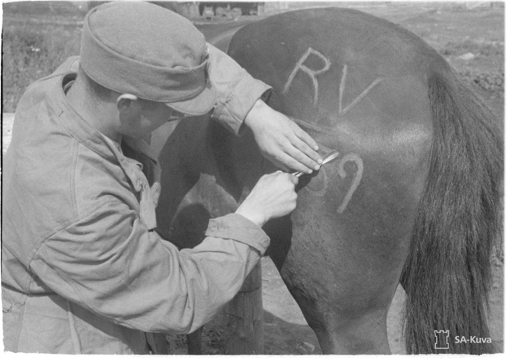 KUVA 20: Rekisterinumeroiden tekoa hevosille URR:n 5. eskadroonassa. Kuva: E. Nurmi 26.7.1942.