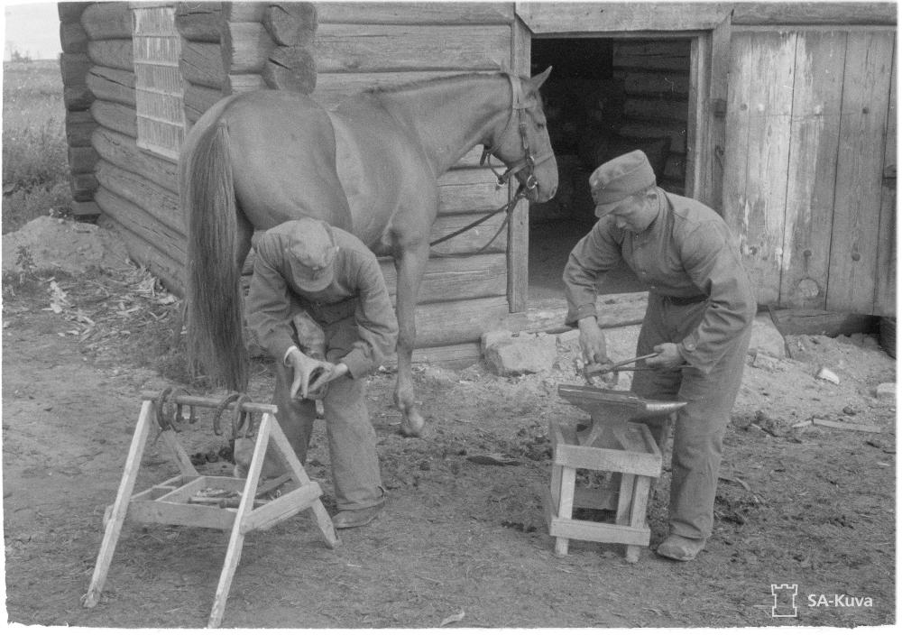 KUVA 21: Hevosten kengitystä Sungussa. Kuva: E. Nurmi 26.7.1942.