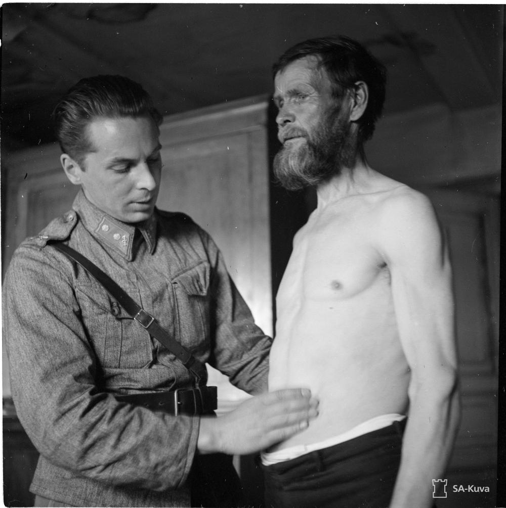 KUVA 23: Kasman kylässä ratsuväellä oli venäläisen siviiliväestön vastanotto kerran viikossa. Kuvassa URR:n lääkintäluutnantti Montell tutkii vanhaa venäläismiestä. Kuva: E. Nurmi 29.7.1942