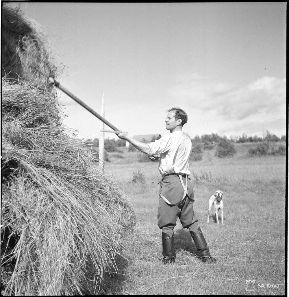 KUVA 24: URR:n komentaja everstiluutnantti von Essen heinätöissä. Kuva: E. Nurmi 4.8.1942.