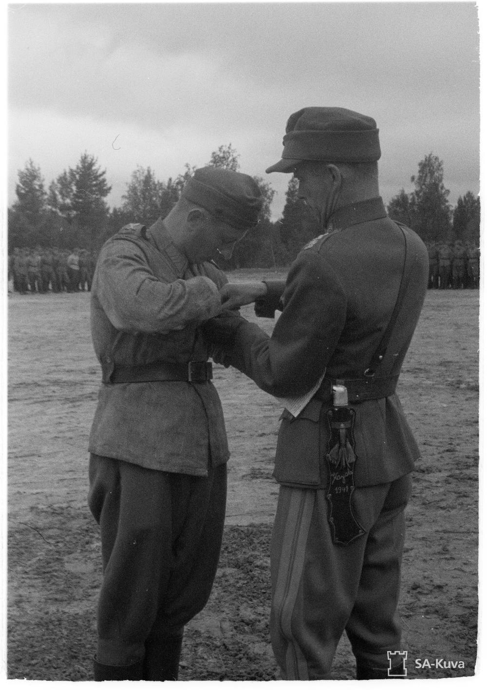 KUVA 25: Hämeen Ratsurykmentin komentaja eversti Gustaf Ehrnrooth kiinnittämässä Mannerheim-ristiä kersantti Lauri Skytän rintapieleen Itä-Karjalassa. Kuva: E. Nurmi 9.8.1942.