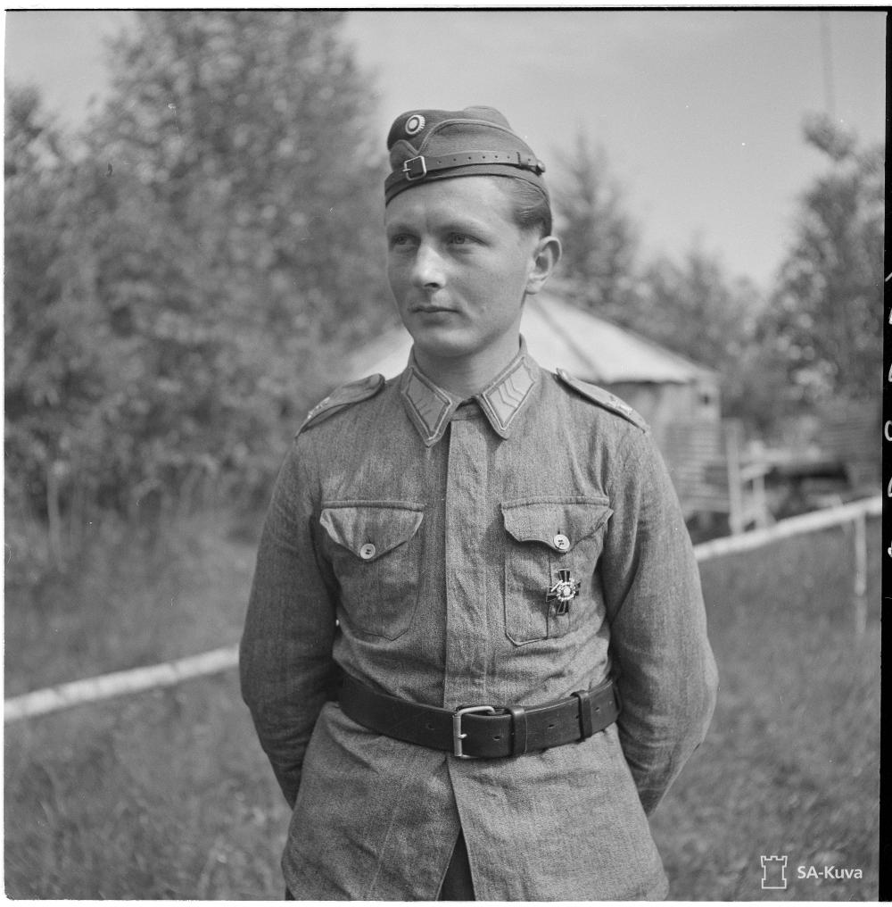 KUVA 26: Kersantti Lauri Skyttä. Hämeen ratsurykmentin 3. eskadroonan joukkueenjohtaja kuvattuna Mannerheim-risti rinnassaan. Hänestä tuli ritari numero 68. Kuva: E. Nurmi 9.8.1942.