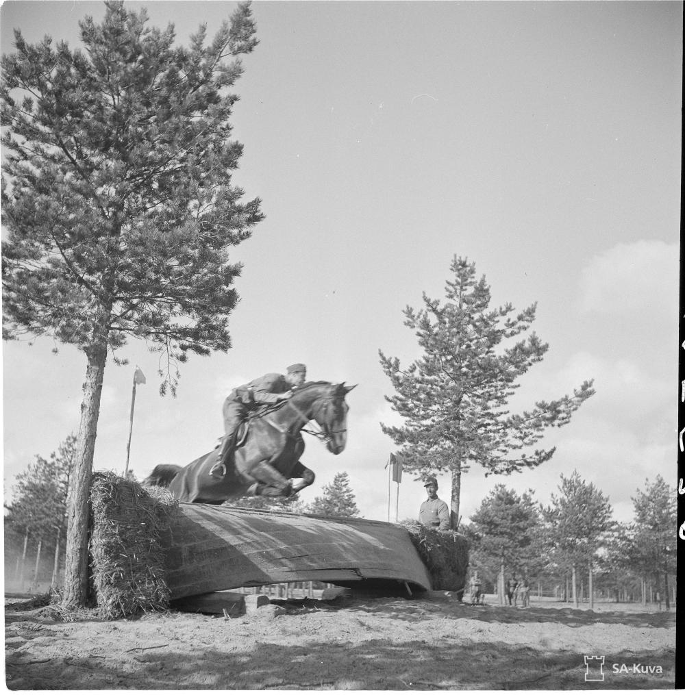 KUVA 29: Alkuperäinen kuvateksti: "Itä-Karjalan toiset suuret ratsastuskilpailut Sungussa: Ratsumestari Palokangas, hevonen "Ramme", 4/URR." Kuva: E. Nurmi 23.8.1942.