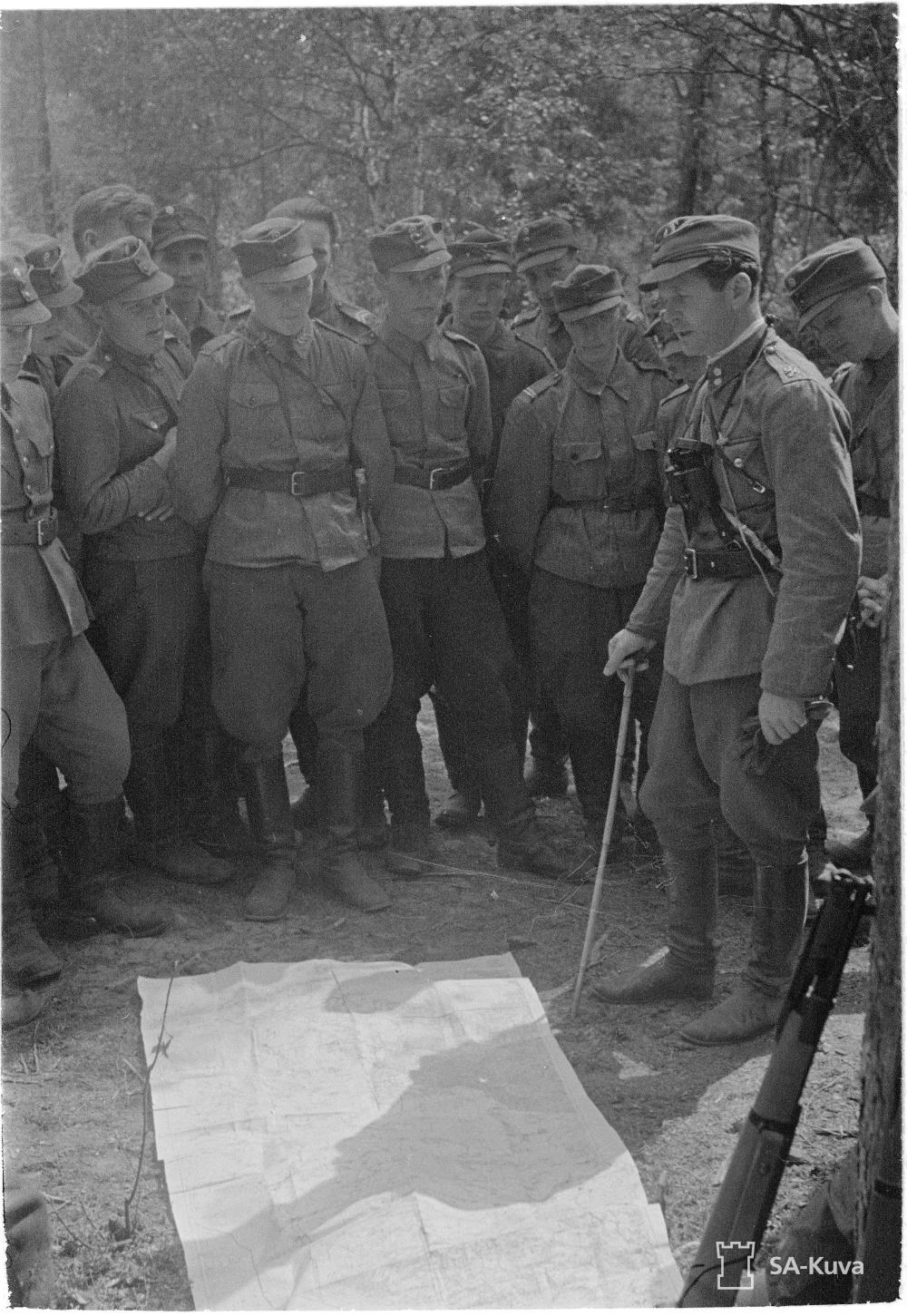 KUVA 3: Everstiluutnantti von Essen selostaa tilannetta URR:n 1. eskadroonan joukkueelle ja ryhmänjohtajille. Kuva: T.V. Vuorela 11.7.1941.