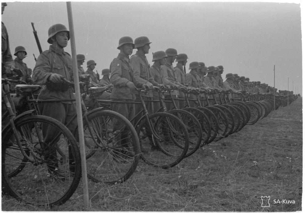 KUVA 30: URR:n kevyet polkupyörä- ja viestieskadroona URR:n paraatissa Sungussa. Kuva: E. Nurmi 7.9.1942