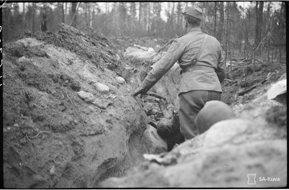 KUVA 31: Ratsuväen upseeri ja Lappeenrannan Rakuunamäellä pitkään ennen sotia vaikuttanut legendaarinen everstiluutnantti Arnold Majewski tarkastamassa taistelun jälkiä Repolassa Rukajärvellä. Liian varomattomasti toiminut Majewski kuoli vain hetki kuvan ottamisen jälkeen venäläisen tarkka-ampujan luodista. Syntyperältään suomalais-puolalaista sotilassukua oleva ja suomea murtaen puhunut Majewski komensi kuollessaan Jalkaväkirykmentti 10:n 1. pataljoonaa. Kuva: Ilmari Laukkonen 10.10.1942.