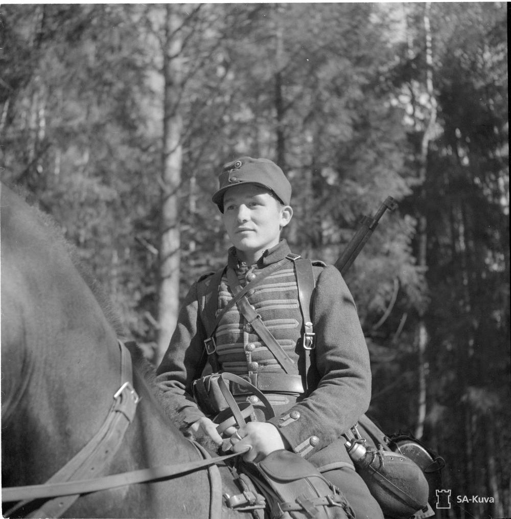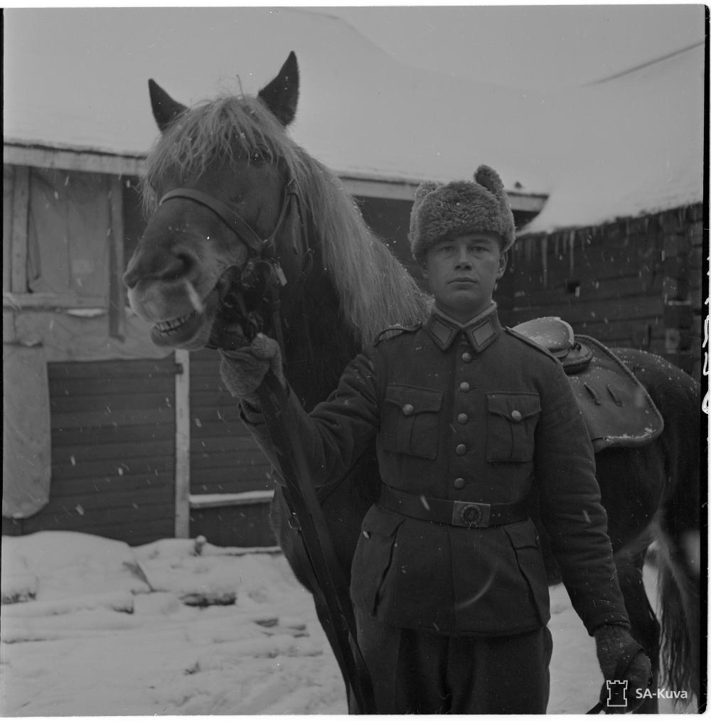 KUVA 33: Hämeen Ratsurykmentin 1. eskadroonan ratsumies Risto Lahti iloisine ratsuineen. Kuva: Sotilasvirkailija J.Taube 6.2.1944.