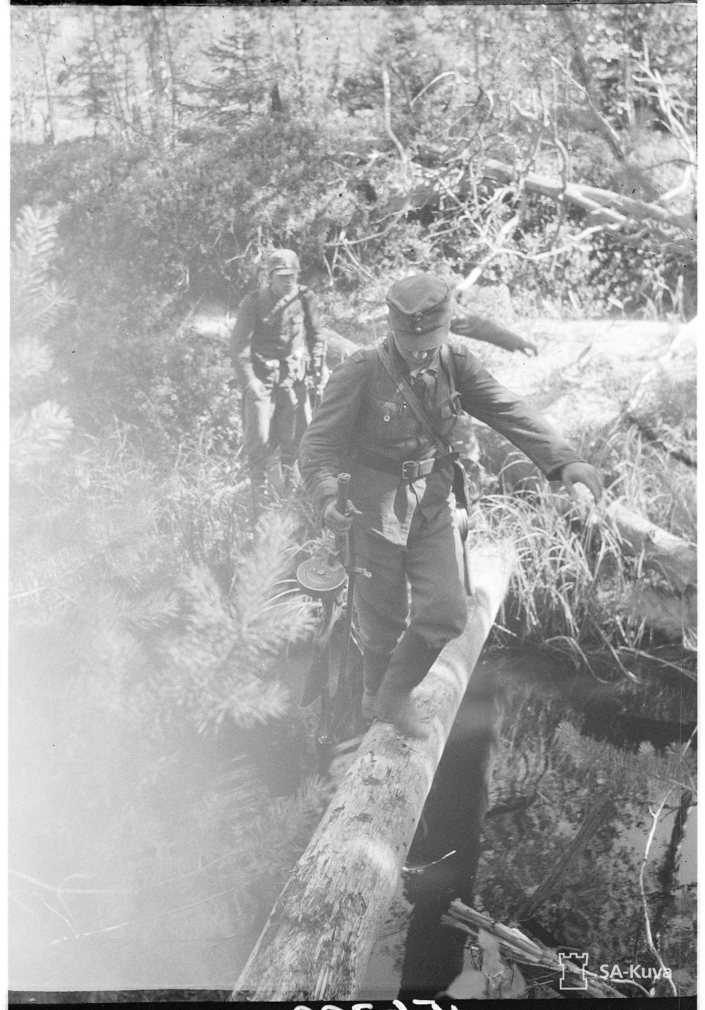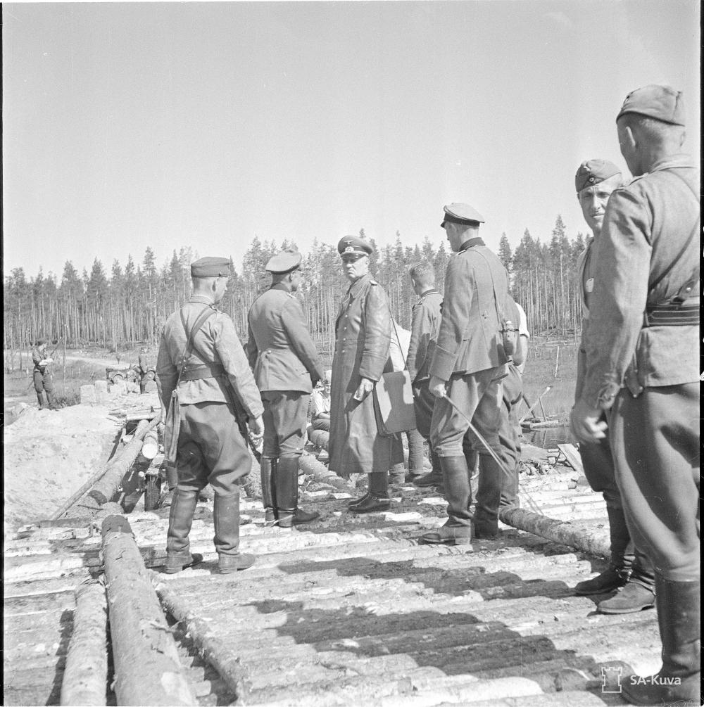 KUVA 7: Saksalaisen 163. jalkaväkidivisioonan komentaja kenraali Erwin Engelbrecht keskustelee saksalaisten pioneerien rakentamalla sillalla upseeriensa ja JP 1:n komentajan everstiluutnantti Wahlbeckin kanssa. Saksalaiset osallistuivat jatkosodan hyökkäysvaiheessa heinä-elokuussa 1941 Tolvajärven ja Ägläjärven alueen taisteluihin. Kuva: Luutnantti Pekka Kyytinen 6.8.1941.