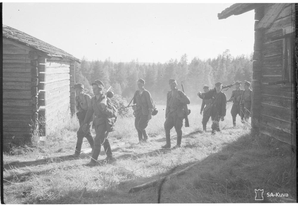 KUVA 35: Väsyneitä Hämeen Ratsurykmentin taistelijoita Ilomantsin Lehmivaaran mottitaisteluiden aikana. Alkuperäinen kuvateksti kertoo, että ”joukot ovat matkalla kohti Hullaria, johon vihollinen oli pureutunut erittäin lujasti kiinni.” Kuva: Sotilasvirkailija Armas Viitasalo 31.7.1944.