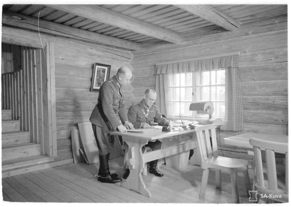 KUVA 36: Kenraalimajuri Erkki Raappana ja everstiluutnantti Susi Raappanan työhuoneessa Ilomantsissa. Työpöytänä toimii tavallinen pirttipöytä. Ratsuväki siirrettiin Raappanan alaisuuteen Ilomantsin kovissa torjuntataisteluissa kesällä 1944. Kuva: Sotilasvirkailija P. Jänis 30.6.1944.