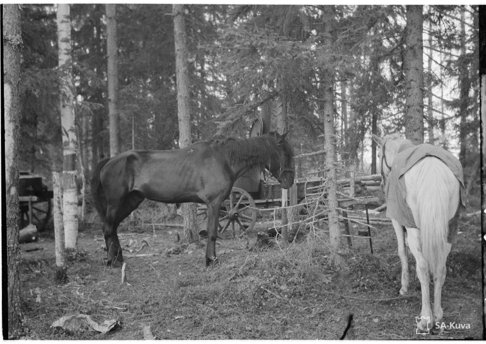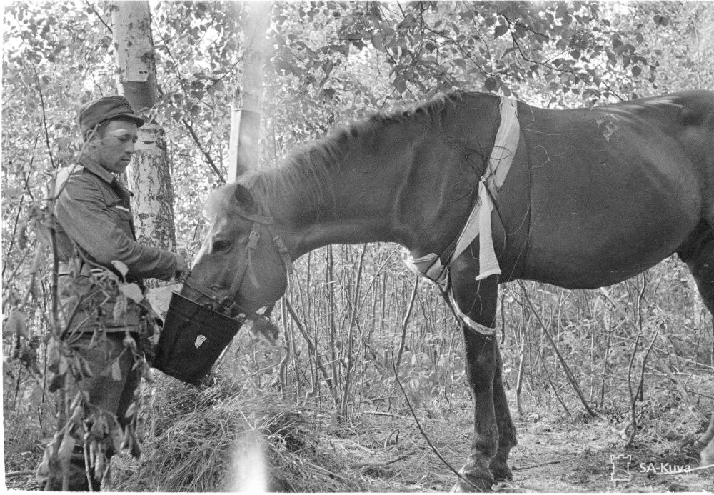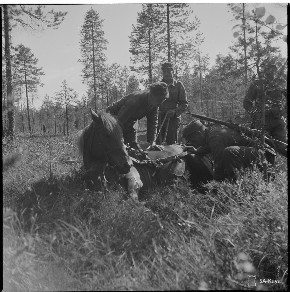 KUVA 4: Kranaatinsirpaleista haavoittunut hevonen juomassa Nuijamaalla. Kuva: Sotamies K. Kivi 29.7.1941.