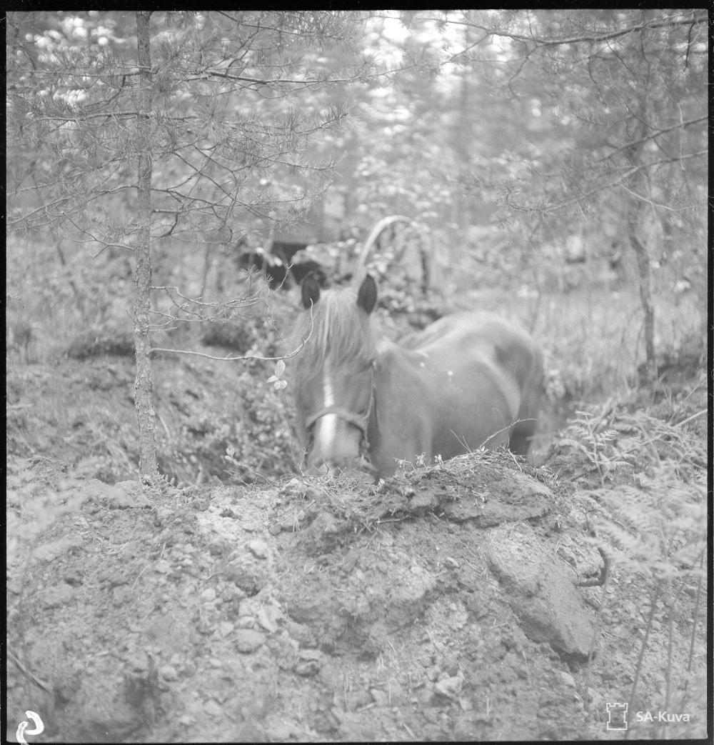 KUVA 38: Hevonen sirpalesuojassaan. Kuva: Sotilasvirkailija Uuno Laukka 28.6.1944.