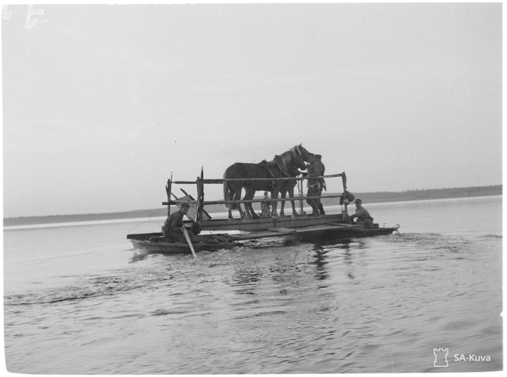 KUVA 39: Hevosten kuljetusta ruuhilautalla järven yli Repolan seudulla Rukajärvellä. Alkuperäinen kuvateksti mainitsee 42 hevosta siirretyksi tällä tavoin. Kuva: Luutnantti Ilmari Laukkonen 25.6.1944.