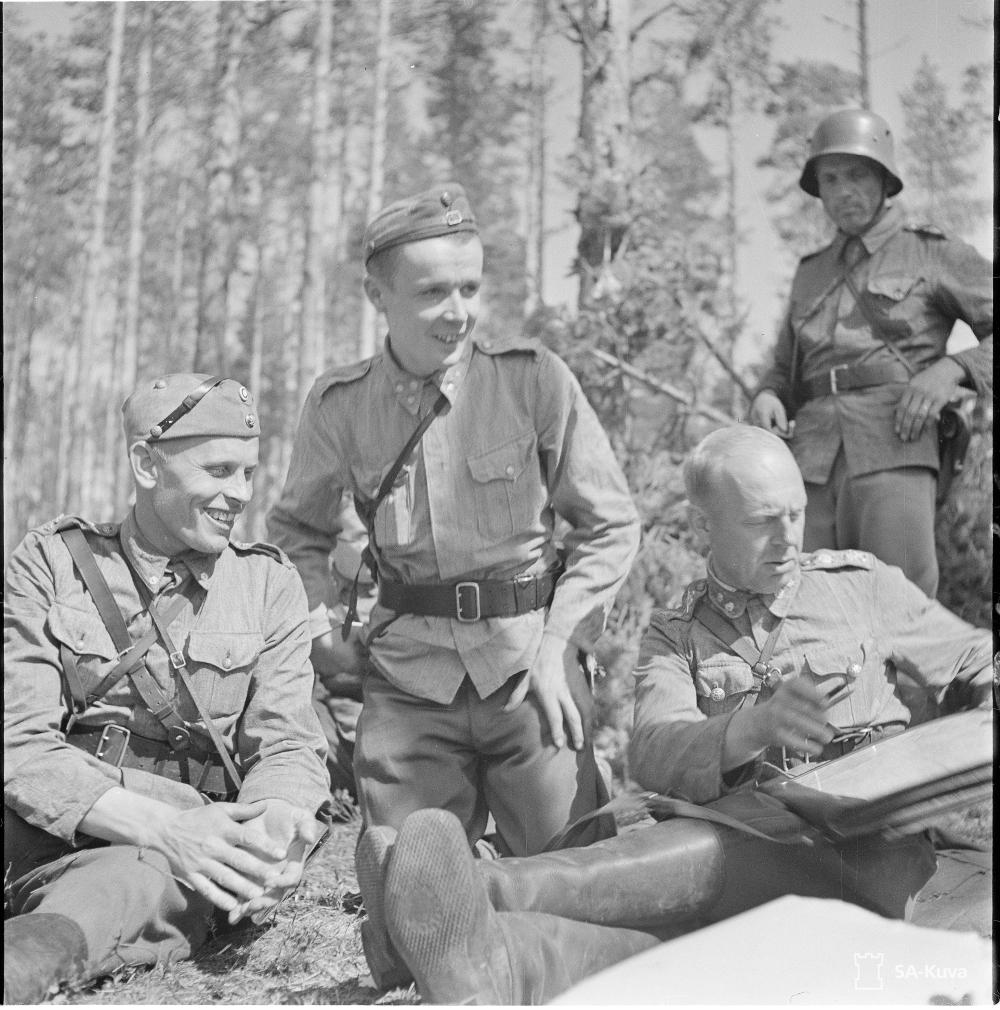 KUVA 6: Alkuperäinen kuvateksti: "Esikunnan piiristä: motti on nyt varma, sen näkee upseerien kasvoistakin." Kuvassa Jääkäripataljoona 1:n upseereita. JP 1 kuului jatkosodassa Ratsuväkiprikaatiin. Ilman päähinettä joukkoyksikköä vuosina 1940-1943 komentanut everstiluutnantti Ragnar Wahlbeck. Hän kaatui kesän 1944 torjuntataisteluissa Jalkaväkirykmentti 49:n komentajana. Kuva: Luutnantti Pekka Kyytinen 6.8.1941.