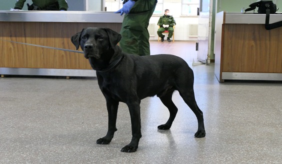 Kuvassa sotakoira Leevi on tarkkana, ettei varuskuntaan tuoda huumeita.