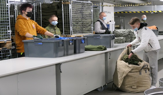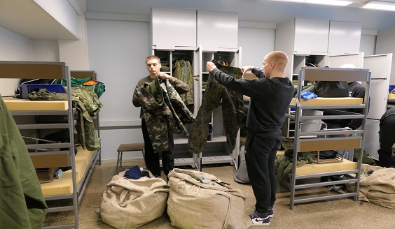 Päivän ohjelmassa oli myös varusteiden hakeminen varusvarastolta. Jalkineita, sukkia, paitoja, pakkastakki, maastopuvun housut, lakki, pakki, kenttäpullo... Iso säkki täynnä vaatteita ja varusteita piti kantaa omaan tupaan. Jos painavaa säkkiä ei jaksanut yksin kantaa, niin kaveria autettiin kyllä.