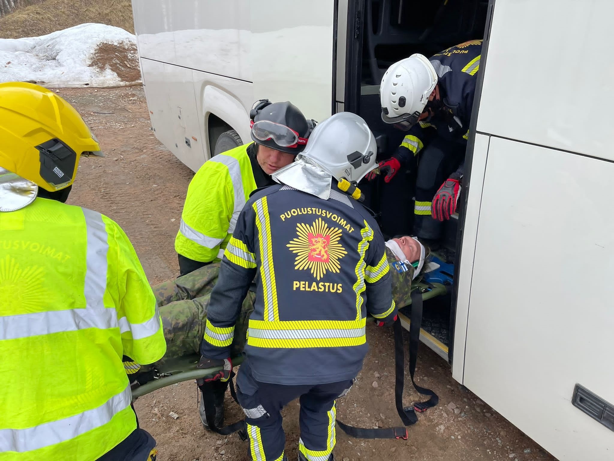 Kuvia harjoituksen pelastusharjoiuksista ja tilanteista: Potilaan siirtoharjoitus linja-autosta.