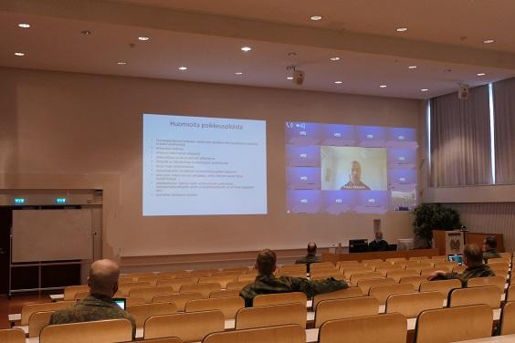 Olkkosen luennolle osallistui useita kymmeniä Maasotakoulun henkilökuntaa niin kotoaan tai osastoittain varuskunnasta etänä. Myös itse luennoitsija puhui nettiyhteyksien kautta kotoaan käsin.