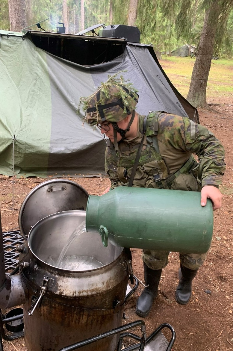 - Eroavaisuuksia tietenkin on, koska Puolustusvoimat panostaa maastossa muonittamiseen ja siihen liittyvään hygieniaan. Puolustusvoimien tarjoamassa koulutuksessa panostetaan hygieniaan enemmän kuin siviilissä, koska yhteisö on hyvin tiivis ja sairaudet leviävät hyvinkin nopeasti. Muonitettava joukko on myös isompi täällä, kuin siviilissä. Opimme myös, kuinka maasto-olosuhteissa muonitetaan. Puolustusvoimien kalusto on suunniteltu kestämään taistelutilanteissa, jonka vuoksi se ei ole automatisoitua, toisin kuin siviilissä.