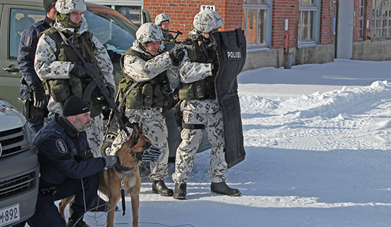 Vaasa-Vasa18 -harjoitukseen osallistuvat sotilaspoliisit harjoittelivat mm. yhteistoimintaa Pohjanmaan poliisin koirapartion kanssa.