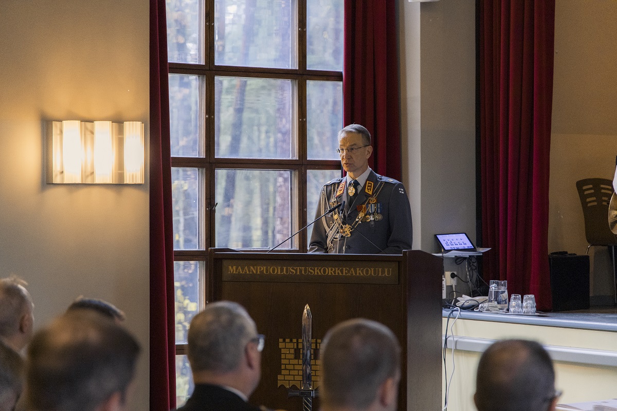 Maanpuolustuskorkeakoulun rehtori, kenraalimajuri Mika Kalliomaa, kertasi juhlapuheessaan yleisesikuntaupseerikoulutuksen historiaa. Suomessa ylemmän tason sotilaallista koulutusta on järjestetty jo yli sadan vuoden ajan, kun laki Sotakorkeakoulusta astui voimaan 3.11.1924. Historian eri vaiheista ja muuttuneista opetussuunnitelmista huolimatta on koulutuksen keskeisimpänä tavoitteena säilynyt taito soveltaa teoriaa käytännön työssä.