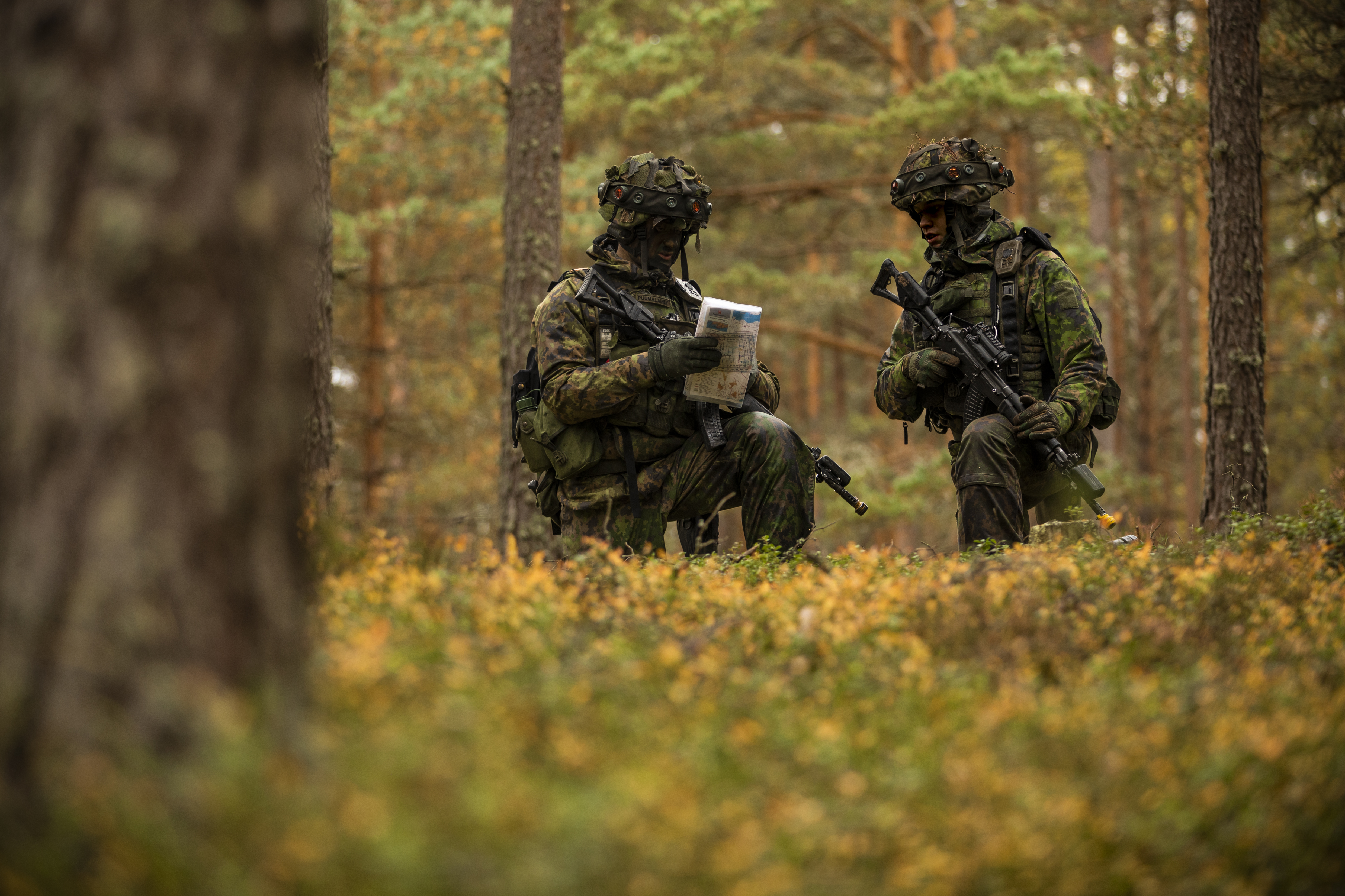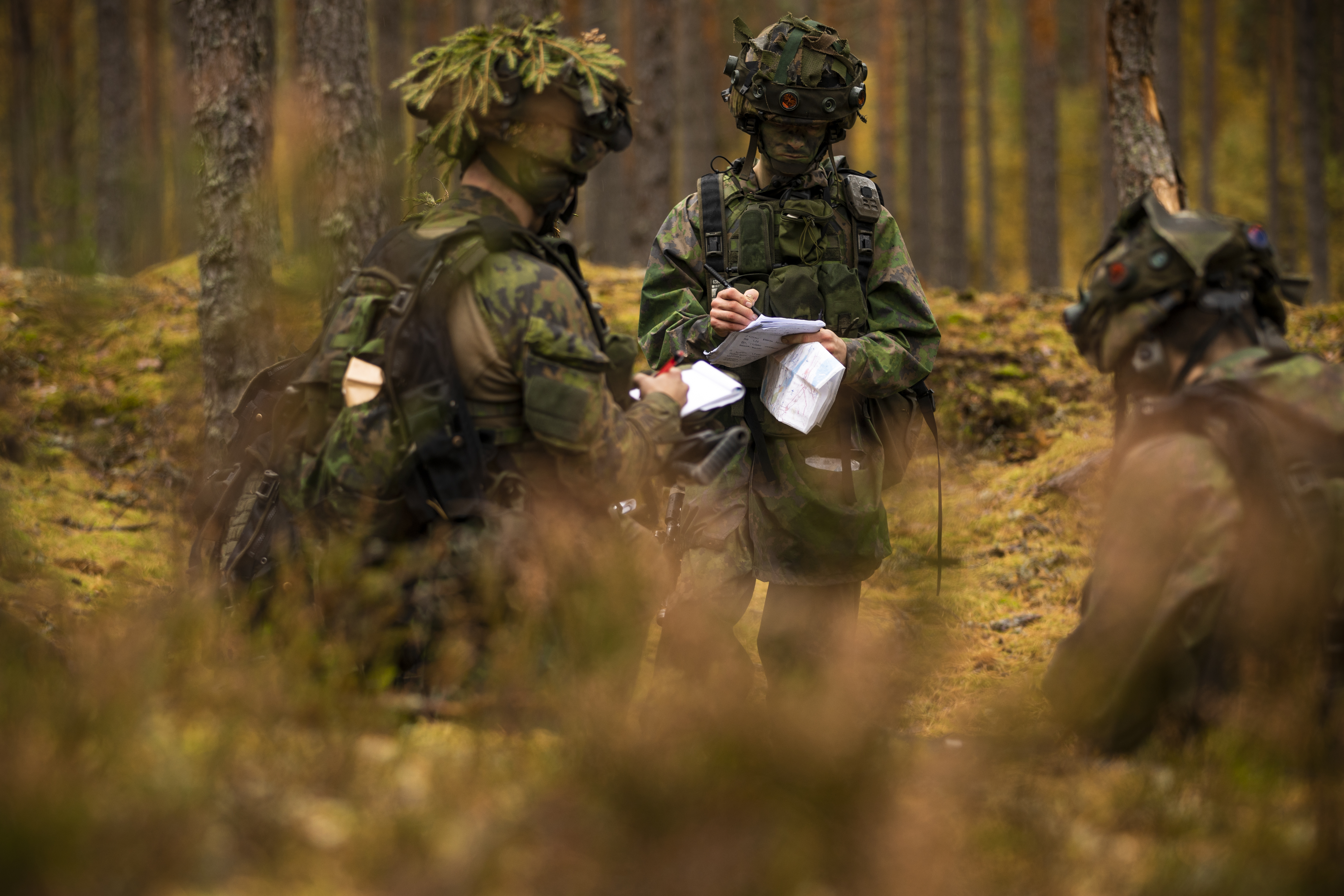 108. kadettikurssin maasotalinjan kadetit ja 91. merikadettikurssin rannikkojoukko-opintosuunnan kadetit viettivät viime viikon syksyisessä Syndalenissa. Kyseessä oli johtamisen harjoitus, jonka päätavoitteena oli harjaantua komppanian päällikön sekä joukkueen- ja ryhmänjohtajan rooleissa. Viiden päivän aikana kadetit suorittivat useita useamman tunnin kaksipuoleisia taisteluja, joissa johtotehtäviä vaihdeltiin.